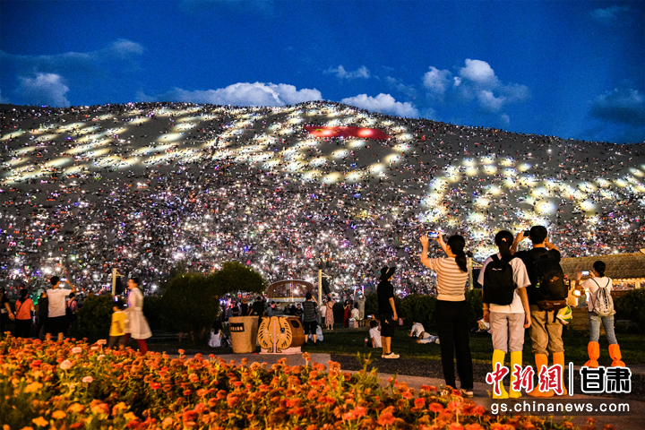 盛夏7月,每當(dāng)夜幕降臨后,甘肅省敦煌市鳴沙山月牙泉景區(qū)被精心布置的燈光點(diǎn)亮,上萬(wàn)名游客手機(jī)的燈光與天空中的繁星交相輝映,營(yíng)造出一種夢(mèng)幻般的浪漫氛圍。