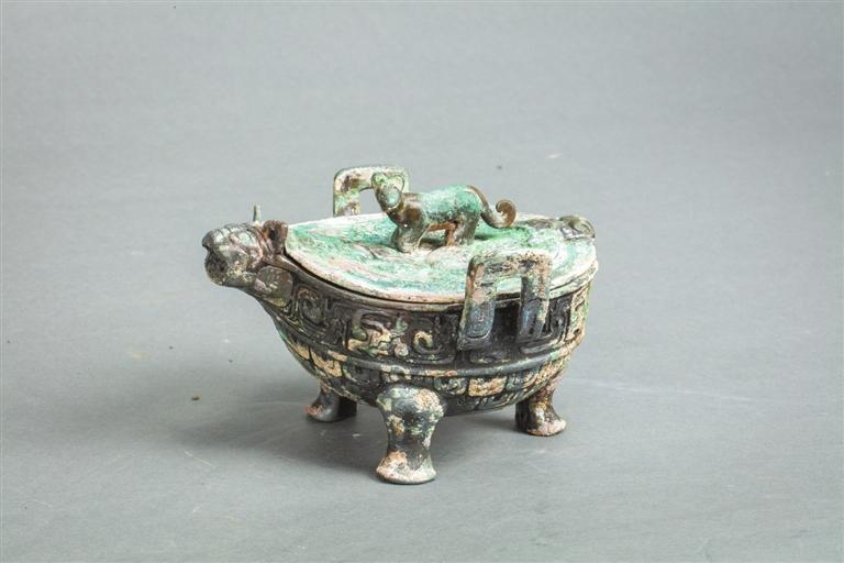 山西省侯馬市上馬村14號墓出土。器為直口窄平沿,口沿前部有虎頭形管狀流,雙附耳,腹部圓收形成圜底,下承三獸蹄足。捉手的虎頭向左前方斜視,虎尾下垂后向上卷曲,流口虎嘴大張,雙目凝視,雙耳直立,器口沿下飾獸目交連紋,腹部飾重鱗紋。