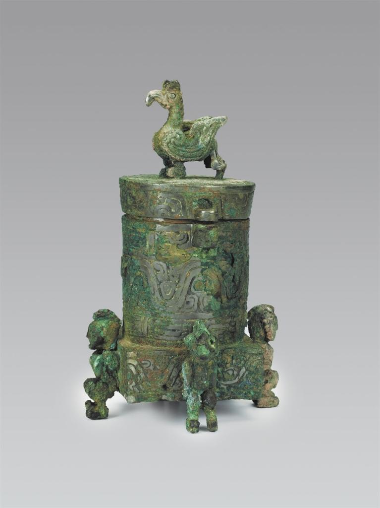 山西省曲沃縣北趙村晉侯墓地63號墓出土。圓筒形,帶蓋,蓋與器體以子母口套合,蓋平頂,上有圓雕立鳥形鈕,鳥彎喙,雙目圓睜,作展翅欲飛狀。器為平口,口沿有一對貫耳,直壁,方形底座,底座四壁各有一個(gè)人形足以承器體。人發(fā)髻高聳,赤身裸體,屈膝下蹲,作奮力抬舉器物狀,形象寫實(shí)生動。方座飾波曲紋,內(nèi)底有兩只小鈴,可發(fā)聲。蓋頂飾斜角云紋一周。蓋沿和口沿飾變形獸體紋,筒腹和方座飾波曲紋,筒下層飾鱗紋一周。這種形制的青銅器尚屬首見,其功用還有待于深入研究,但它獨(dú)特的藝術(shù)造型和裝飾卻可以說是集眾器之長,獨(dú)步天下。