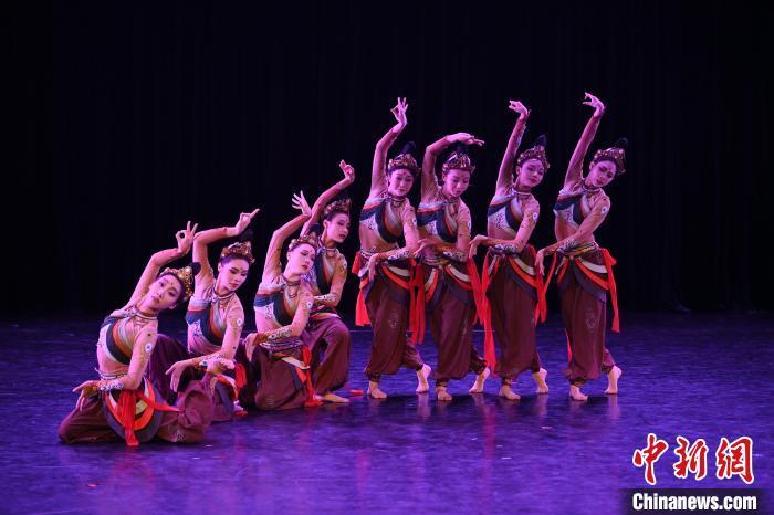 9月6日,由甘肅省人民政府臺灣事務(wù)辦公室、西北民族大學(xué)聯(lián)合舉辦的“‘尋甘同味·舞樂敦煌’第七屆臺灣大學(xué)生敦煌文化研習(xí)營”結(jié)營式在甘肅蘭州西北民族大學(xué)舉行。來自臺灣中國文化大學(xué)、臺灣藝術(shù)大學(xué)、臺灣體育運(yùn)動(dòng)大學(xué)與西北民族大學(xué)的65名師生在結(jié)營式上,合作進(jìn)行了舞蹈音樂創(chuàng)作成果展演,展示了傳統(tǒng)與現(xiàn)代舞蹈的完美融合。圖為當(dāng)日進(jìn)行的舞蹈音樂創(chuàng)作成果演出。中新社記者 李亞龍 攝