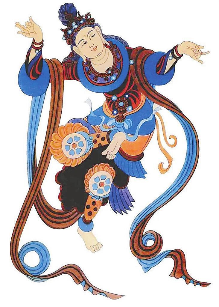 敦煌莫高窟,窟窟有壁畫,拼接起來長達45000多平方米,有世界上“最大畫廊”之稱。這些壁畫中,幾乎每幅都有舞蹈形象,如在窟頂、龕楣、藻井遨游的飛天,憑欄上的天宮伎樂,經(jīng)變畫中的娛佛、敬佛的獻舞者——伎樂天,出行圖中跳著具有濃郁生活氣息的世俗樂舞,以及富有舞蹈美感的彩塑菩薩、天王力士等,琳瑯滿目,精妙絕倫。這些舞蹈形象充分反映了從十六國北朝至元代千余年來不同歷史時期的舞蹈服飾、形態(tài)、風(fēng)貌,為我們挖掘、整理、弘揚中華民族舞蹈文化提供了十分珍貴的形象資料。