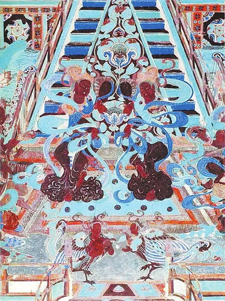 西域樂舞的輸入早在漢代以前即已開始。隨著絲綢之路的開通,中原文化西傳,西域文化東漸更為頻繁密切,隋唐時代達到全盛期。隋置《七部樂》有五部屬西域;唐設(shè)《十部樂》有七部是西域的,即使《清商樂》也雜以龜茲樂音。在壁畫舞姿上,西域風(fēng)格是十分明顯的,如緊身袒露的服飾,佩戴的瓔珞串鈴,手勢的豐富,手臂的棱角,以袒腹、露臍、半裸、體態(tài)的S形和直角的三位體式,還有赤足而舞等特征,至今在我國新疆和印度舞蹈中不乏其形跡。