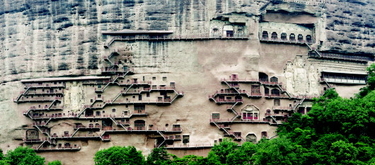麥積山石窟與敦煌莫高窟、大同云岡石窟、洛陽(yáng)龍門石窟齊名,是中國(guó)四大石窟之一,被譽(yù)為“東方雕塑陳列館”。公元759年杜甫流寓天水,作《山寺》詩(shī):“野寺殘僧少,山園細(xì)路高。麝香眠石竹,鸚鵡啄金桃。亂石通人過,懸崖置屋牢。上方重閣晚,百里見秋毫。”其自然景觀與人文景觀完美結(jié)合,是世界文化遺產(chǎn)、全國(guó)重點(diǎn)文物保護(hù)單位,也是中原北方地區(qū)最早的皇家石窟,洞窟內(nèi)還保存了中國(guó)最早的連環(huán)畫作品。