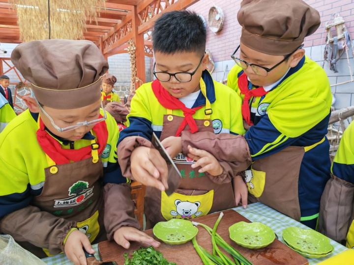 蘭州市城關(guān)區(qū)伏龍坪小學(xué)六年級1班的裴玉龍(左一)和同學(xué)們動手嘗試切蒜苗。新華社記者 白麗萍 攝