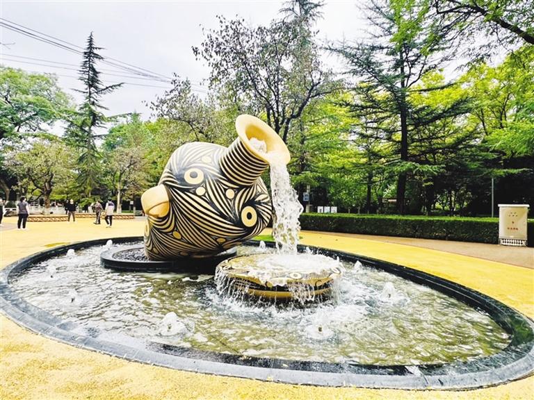 走進(jìn)公園(東口),入口處以“大河厚土孕彩陶”為主題的彩陶墻格外顯眼,墻上鑲嵌著不同造型和樣式的彩陶,分別介紹了大地灣文化彩陶、仰韶文化彩陶、馬家窯文化彩陶、齊家文化彩陶四個(gè)不同歷史發(fā)展時(shí)期。沿健身步道向西行進(jìn),體量巨大的馬家窯旋紋彩陶尖底瓶正向旋紋彩陶盆內(nèi)倒入“黃河之水”,這一景觀便是“彩陶流水”節(jié)點(diǎn),景觀造型采用跌水、涌泉的形式,打造出彩陶流水的動(dòng)態(tài)效果,象征著黃河文化的源遠(yuǎn)流長(zhǎng)。
