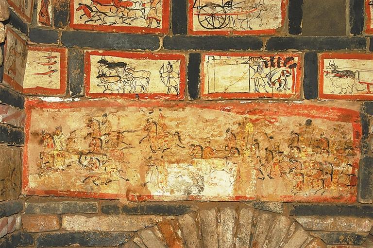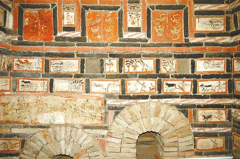 魏晉十六國磚畫在墓中的布局、組合,體現(xiàn)出 “滿”和“層”的特點(diǎn)。整個(gè)墓室,各方位、各邊角以及過道均鑲砌畫磚。以嘉峪關(guān)果園—新城5號墓畫磚的布局為例,各層間隔、同層緊鄰的畫磚,給觀者的感覺就是整幅壁畫,但每一塊又是一個(gè)獨(dú)立的畫面,這種“樣式”,是魏晉十六國時(shí)期的河西匠工、畫工,在繼承漢晉磚室墓的同時(shí),將畫像磚在墓室布局的方式也加以接受。艷麗的色彩,“忠實(shí)”生活的寫實(shí)手法,又是河西畫匠們的創(chuàng)新和發(fā)揮。