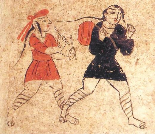 除此之外,河西彩繪壁畫磚圖像中,還有一些反映娛樂的圖像,主要有樂舞圖和六博圖。高臺地埂坡壁畫中的“角抵百戲”中,一著辮者在作表演,他小腿部網(wǎng)狀綁腿,蹲踞,雙手?jǐn)傞_,似乎是在表演魔術(shù),又似乎是在歡迎到場的人們。“擊鼓”中,兩人網(wǎng)狀繃腿,髡發(fā)梳辮,著黑裝者背鼓,著紅裝者持雙鼓槌準(zhǔn)備擊鼓。孫機(jī)先生謂,戰(zhàn)國迄漢盛行六博,博具和博戲的圖像在考古資料中不乏其例。甘肅以武威磨嘴子漢墓出土木六博俑為例。六博俑以簡單明確的藝術(shù)造型,刻畫了兩個(gè)老者全神貫注博弈的場面,惟妙惟肖地表現(xiàn)出對弈時(shí)蓄勢待發(fā)的場面。在高臺壁畫墓中的博戲場面略有不同,二博者戴船形帽,打手勢。從相貌看,很可能是少數(shù)民族。高臺出土彩繪壁畫磚上,兩人動作幅度更大,左邊一人的黃紅色著裝和博具上的零散物品,顯得場面更為熱烈激情。