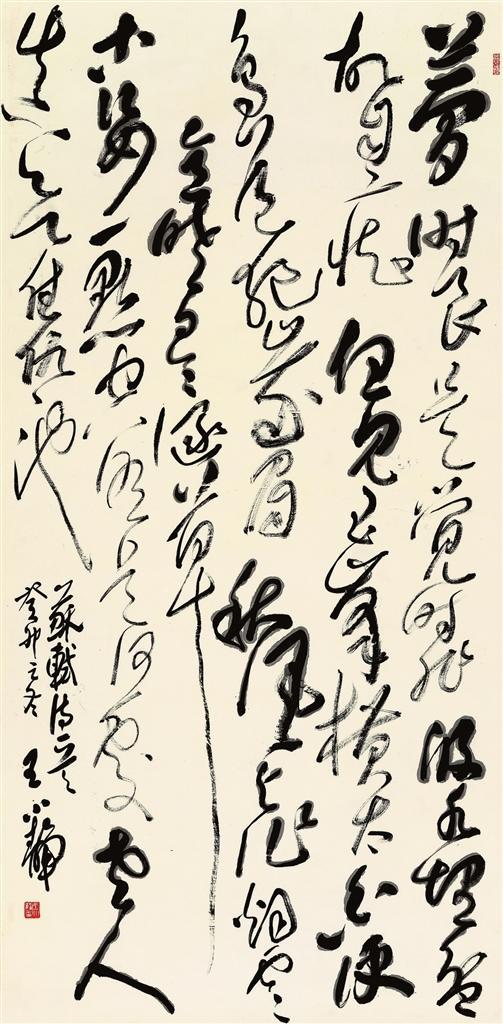 隴南有著得天獨(dú)厚的碑學(xué)資源,以《西狹頌》為代表的碑刻見(jiàn)證了隴南金石碑學(xué)的延續(xù)。王小靜書(shū)法中的篆隸素養(yǎng)即來(lái)自于此,她大量臨習(xí)金文、漢碑,取其古拙之趣,將碑學(xué)強(qiáng)調(diào)的線條運(yùn)用在草書(shū)中,涵養(yǎng)了草書(shū)的內(nèi)韻,在澎湃開(kāi)張的草書(shū)體態(tài)中顯示出了厚重的體積感和塊面感,一張一弛之間將一種真正源于內(nèi)心對(duì)草書(shū)的熱愛(ài)凝結(jié)于紙面。從內(nèi)心情感對(duì)草書(shū)的萌動(dòng)到草書(shū)創(chuàng)作進(jìn)入自由抒情階段,這是一次漫長(zhǎng)的學(xué)習(xí)之旅。王小靜一直在這條路上奮進(jìn),至今仍然堅(jiān)持臨摹古代經(jīng)典,尤其注重把對(duì)篆隸的臨摹推向深入。她認(rèn)為,不斷深入古代經(jīng)典,從傳統(tǒng)中尋找個(gè)人的創(chuàng)新空間,才是有價(jià)值的創(chuàng)新。
