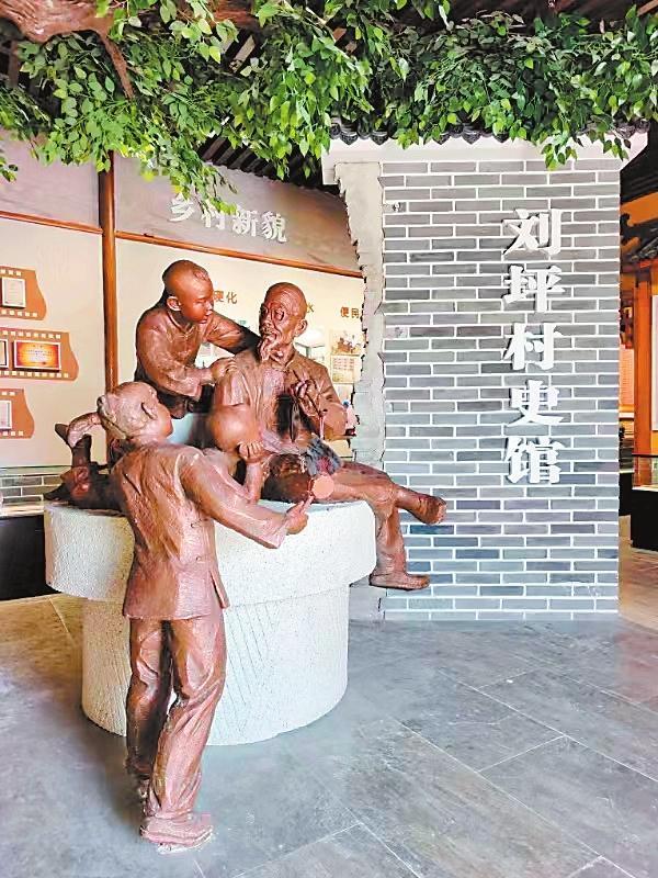 年復一年的寒來暑往中,大榆樹,也就成了劉坪村的望鄉(xiāng)臺。每個村莊,都有它的望鄉(xiāng)臺,它承載著人們共同的記憶,是人們重溫鄉(xiāng)愁的地標,永遠鐫刻在人們的心底。2000年,電視劇《黃沙下面是沃土》的劇組來到劉坪村拍攝取景,村里的望鄉(xiāng)臺大榆樹被拍進電視劇畫面。在劉坪村村史館布設中,專家和學者數(shù)易村史館方案,最終確定在村史館正門之內(nèi)塑造一組雕塑,意思是由一位老人講述劉坪村的村史,作為村史館的題眼,村史館內(nèi)還陳列了《劉坪村志》,分為建置、地理、村落文化、風土人情等14卷,共40萬字。館內(nèi)能播放劉坪村村史專題片《耕讀傳家》。