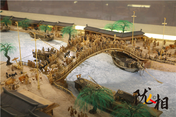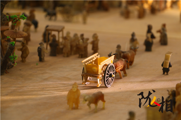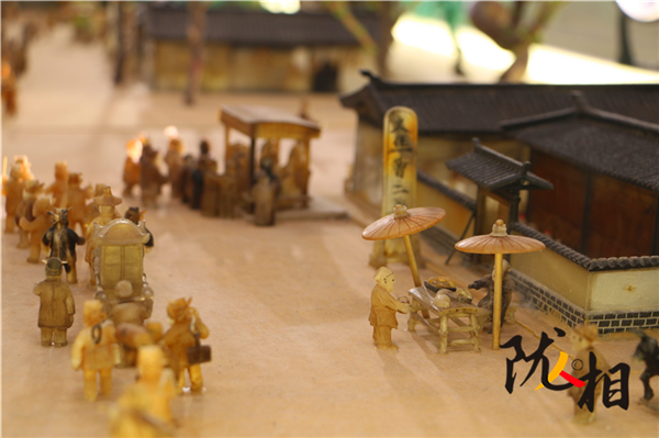 劉金祿歷時(shí)25年創(chuàng)作的白牦牛角微雕版《清明上河圖》,長16米,寬1.6米,共微雕人物1460名,動(dòng)物300余頭、房間400余間、大小船只30余艘、牛馬車輛50余輛。小到杯盞酒蝶,大到雕梁畫棟,都有生動(dòng)刻畫,徹底將《清明上河圖》由平面畫作搬上了立體展臺(tái)。