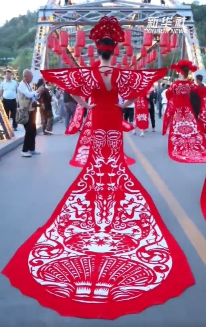 慶陽剪紙源于生活、講究情趣,是勞動人民生產生活、情感氣質、觀念習俗和文化傳承的結晶。著名民俗學家靳之林先生稱剪紙藝人是“真正的藝術家”。1986年,中央美術學院邀請鎮(zhèn)原縣民間美術大師祁秀梅赴北京進行民間美術教學交流,向大學生演示民間剪紙。法國、日本、澳大利亞等國家的藝術家也多次專程到隴東考察民間剪紙藝術。慶陽剪紙已由鄉(xiāng)村婦女手中的小玩意,堂而皇之地步入了國家藝術殿堂——中國民間美術館,并在日、意、澳等國家展覽亮相。圖為身著慶陽剪紙服裝的模特們行走在蘭州中山橋上,驚艷了來往的游客。