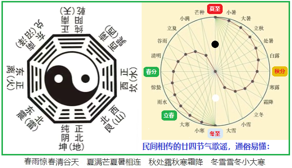 八卦是中華先民理性思維和高度智慧的結晶。華夏7000年前伏羲創(chuàng)制的八卦圖最初是用來分時紀年的,而在此基礎上發(fā)展起來的廿四節(jié)氣后來卻大放異彩。所謂“太極生兩儀,兩儀生四象,四象生八卦”的陰陽變化,其實指的就是四季輪替,它代表了事務孕育、發(fā)展、成熟和衰亡的自然規(guī)律,告訴世人“變化,才是永恒不變的規(guī)律”這一本質!如果在八卦圖上繼續(xù)往下切分,就能很自然地從八卦圖上得到廿四節(jié)氣(見圖)。