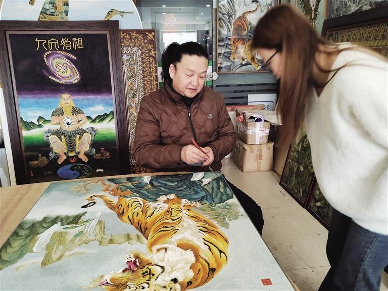 不遠(yuǎn)處的刻葫蘆攤位前,非遺代表性傳承人阮熙越運(yùn)刀如筆,在打磨光潤(rùn)的葫蘆表面刻出圖案。“刻針深淺決定墨色濃淡,蘭州葫蘆皮質(zhì)厚實(shí),才能承載這樣的藝術(shù)語言。”正在體驗(yàn)刻繪的大學(xué)生張萌說。從傳統(tǒng)書畫到現(xiàn)代動(dòng)漫IP,從擺件到車掛,近幾年刻葫蘆在創(chuàng)新中走向大眾。據(jù)文旅部門統(tǒng)計(jì),非遺購物月期間刻葫蘆銷售火熱,成為最受游客青睞的“蘭州名片”。