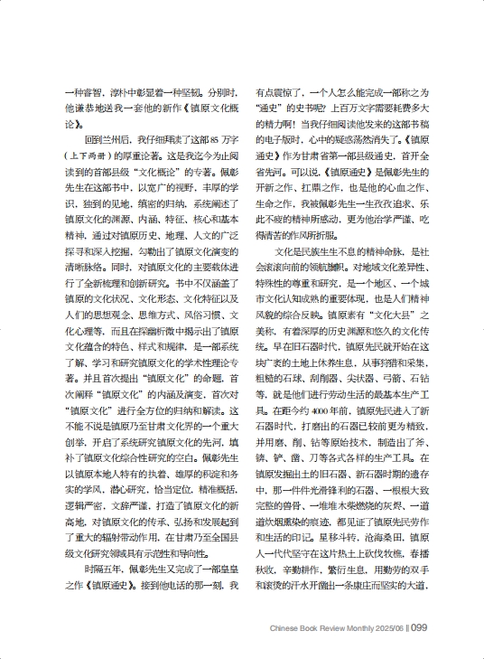 回到蘭州后,我仔細拜讀了這部85萬字(上下兩冊)的厚重論著。這是我迄今為止閱讀到的首部縣級“文化概論”的專著。佩彰先生在這部書中,以寬廣的視野,豐厚的學識,獨到的見地,縝密的歸納,系統闡述了鎮(zhèn)原文化的淵源、內涵、特征、核心和基本精神,通過對鎮(zhèn)原歷史、地理、人文的廣泛探尋和深入挖掘,勾勒出了鎮(zhèn)原文化演變的清晰脈絡。同時,對鎮(zhèn)原文化的主要載體進行了全新梳理和創(chuàng)新研究。書中不僅涵蓋了鎮(zhèn)原的文化狀況、文化形態(tài)、文化特征以及人們的思想觀念、思維方式、風俗習慣、文化心理等,而且在探幽析微中揭示出了鎮(zhèn)原文化蘊含的特色、樣式和規(guī)律,是一部系統了解、學習和研究鎮(zhèn)原文化的學術性理論專著。并且首次提出“鎮(zhèn)原文化”的命題,首次闡釋“鎮(zhèn)原文化”的內涵及演變,首次對“鎮(zhèn)原文化”進行全方位的歸納和解讀。這不能不說是鎮(zhèn)原乃至甘肅文化界的一個重大創(chuàng)舉,開啟了系統研究鎮(zhèn)原文化的先河,填補了鎮(zhèn)原文化綜合性研究的空白。佩彰先生以鎮(zhèn)原本地人特有的執(zhí)著、雄厚的積淀和務實的學風,潛心研究,恰當定位,精準概括,邏輯嚴密,文辭嚴謹,打造了鎮(zhèn)原文化的新高地,對鎮(zhèn)原文化的傳承、弘揚和發(fā)展起到了重大的輻射帶動作用,在甘肅乃至全國縣級文化研究領域具有示范性和導向性。