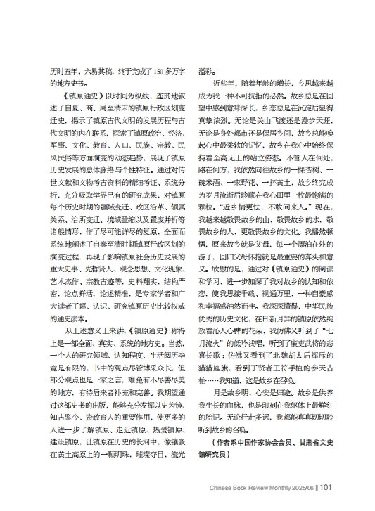 從上述意義上來講,《鎮(zhèn)原通史》稱得上是一部全面、真實、系統的地方史。當然,一個人的研究領域、認知程度、生活閱歷畢竟是有限的,書中的觀點盡管博采眾長,但部分觀點也是一家之言,難免有不盡善盡美的地方,有待后來者補充和完善。我期望通過這部史書的出版,能夠充分發(fā)揮以史為鏡、知古鑒今、資政育人的重要作用,使更多的人進一步了解鎮(zhèn)原、走近鎮(zhèn)原、熱愛鎮(zhèn)原、建設鎮(zhèn)原,讓鎮(zhèn)原在歷史的長河中,像鑲嵌在黃土高原上的一顆明珠,璀璨奪目,流光溢彩。
