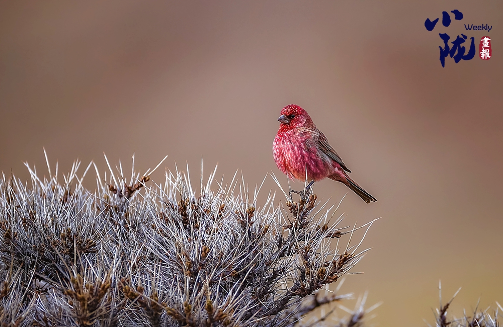 紅眉朱雀,是雀形目燕雀科朱雀屬的鳥類,中等體型,體長約為15厘米。雄鳥的特征是眉紋和臉頰呈淡紫粉色,而上體則有褐色斑駁。雌鳥沒有粉色,難稱“漂亮”,它們?nèi)砘液稚?ldquo;朱”一點也不沾邊兒,實際上,很多鳥類的雌鳥都要比雄鳥暗淡很多,這種暗淡的顏色能幫助它們在孵卵的時候更好地隱蔽,以逃過天敵的捕殺。雄鳥和雌鳥都類似于體型較小的曙紅朱雀。