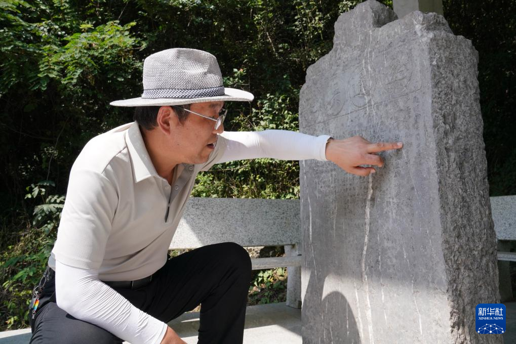 7月14日,在青泥嶺上,徽縣博物館文博副研究館員曹鵬雁在介紹一塊刻有“遠(yuǎn)通吳楚”字樣的清代石碑。新華社記者 馬寧 攝