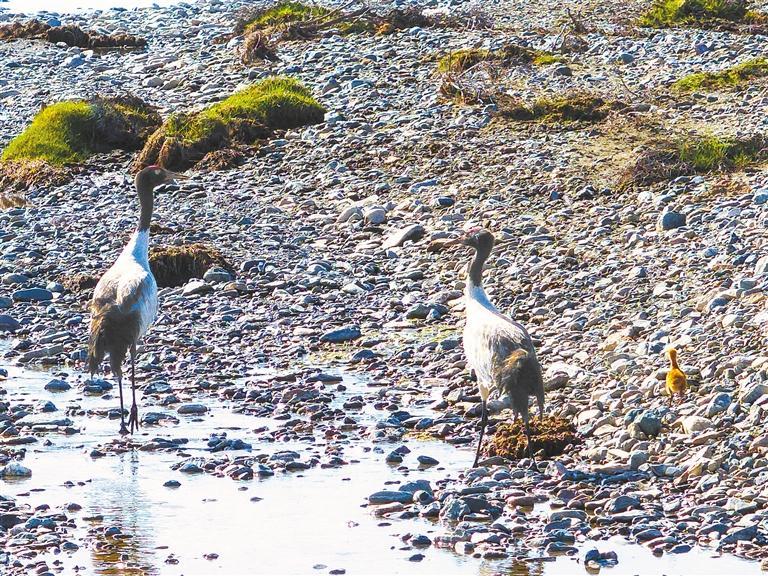甘肅祁連山國家級自然保護區(qū)管護中心出現(xiàn)的三只黑頸鶴。新甘肅·甘肅日報通訊員 李海軍