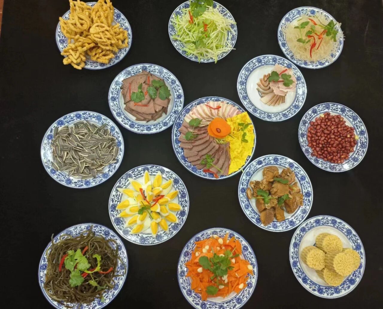 ——“十三花”,寓意胡太后以民為本的執(zhí)政理念;城內(nèi)四個(gè)葷菜,寓意人民四季安康、幸福美滿;骨頭碟和懸肉碟,寓意父骨母血、尊老孝親;肝子碟和雞蛋碟,寓意肝膽相照、心心相??;四個(gè)水菜碟子水圍城,寓意順風(fēng)順?biāo)?、四方平安;城外瓜籽花生碟,寓意多子多福、多祿多壽;路食和果子,寓意衣豐食足、一路平安;最中間一個(gè)大碟全盤為中心,寓意團(tuán)結(jié)聚力、天下一心。