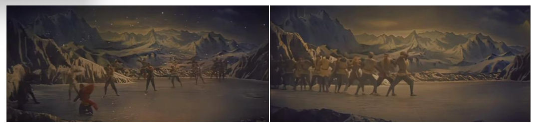 在表現(xiàn)行軍征程時(shí),舞者以身體前傾的大跨步姿態(tài),沿群山布景走出巨大的“S”型曲線(xiàn)。這不是簡(jiǎn)單的隊(duì)形變換,它首先在視覺(jué)上營(yíng)造出千軍萬(wàn)馬綿延不絕的雄渾意象。同時(shí),“S”形曲線(xiàn)本身藝術(shù)化地傳達(dá)了“道路是曲折的,前途是光明的”這一革命哲理。舞者整齊劃一、重心下沉的堅(jiān)定步伐,與沙幕光影營(yíng)造出的風(fēng)沙漫天效果相結(jié)合,共同體現(xiàn)紅軍在艱難險(xiǎn)阻中依然定向不移的鋼鐵意志。