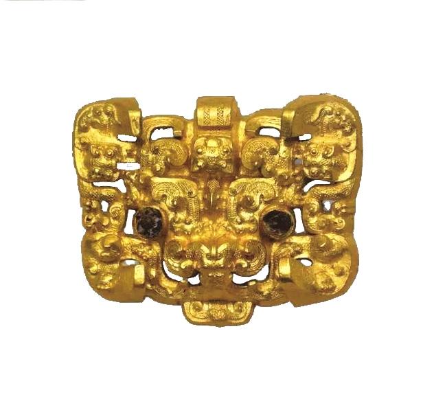 備受關(guān)注的戰(zhàn)國晚期高浮雕獸面紋金帶扣,現(xiàn)藏于甘肅省文物考古研究所。金帶扣的主體為一獸頭,采用高浮雕手法雕出;獸頭上鏤雕出龍獸相斗的圖案,并裝飾有連珠紋、卷云紋、羽狀紋等;獸頭的眼部鑲嵌藍色玻璃珠。此器物具有中原華夏與邊陲戎狄兩種藝術(shù)風(fēng)格。