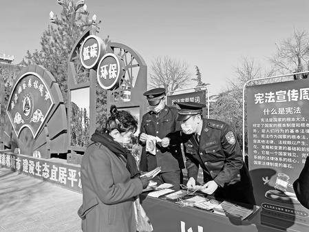 平?jīng)霰O(jiān)獄民警向市民發(fā)放憲法宣傳彩頁。新甘肅·甘肅法制報通訊員白宏斌攝