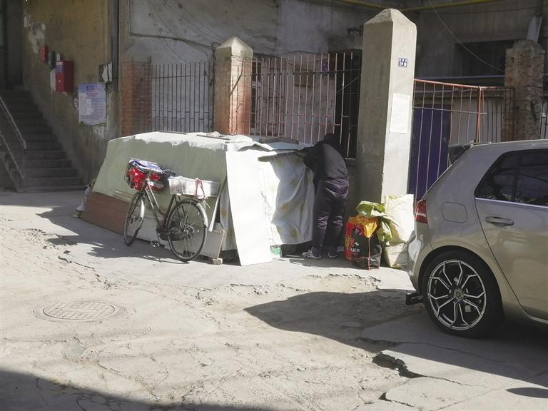 隨后,記者來(lái)到閔家橋59號(hào),破舊的小區(qū)內(nèi)堆積的雜物很多,有人堆積紙箱,有人干脆在小區(qū)院子內(nèi)“圈地”堆放私人物品。“不知道人家在堆放什么,可是進(jìn)門就能看見(jiàn),很不雅觀。”居民李先生說(shuō),小區(qū)是老舊樓院,長(zhǎng)期沒(méi)人管理,衛(wèi)生環(huán)境雖然不差,但是小區(qū)內(nèi)堆積的東西太多。小區(qū)里有一個(gè)收廢品的,每天將回收來(lái)的紙箱堆積在單元樓門口,另一戶人家干脆“圈地”將自家的私人物品堆放在這里,用塑料布遮蓋起來(lái),很不美觀。