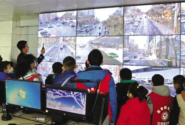 在指揮中心,民警向孩子們介紹了監(jiān)控視頻,講解了電子警察的作用,并通過監(jiān)控畫面詳細(xì)講解交警日常查處違法及出警派警流程。