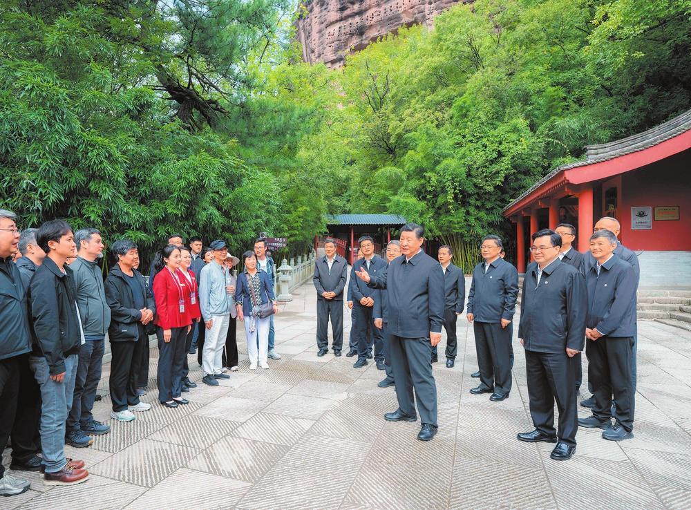 9月10日至13日,中共中央總書記、國家主席、中央軍委主席習近平在甘肅考察。這是11日上午,習近平在天水市麥積山石窟考察時,同現場游客親切交流。新華社記者翟健嵐