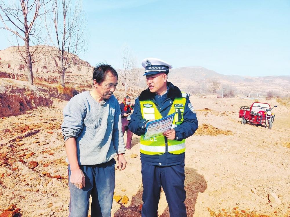 民警向群眾講解法律法規(guī)。3月10日,隴西縣公安局渭陽(yáng)派出所民警深入田間地頭,開展道路交通安全和反電詐宣傳?!  ⌒赂拭C·甘肅法治報(bào)通訊員劉榮攝