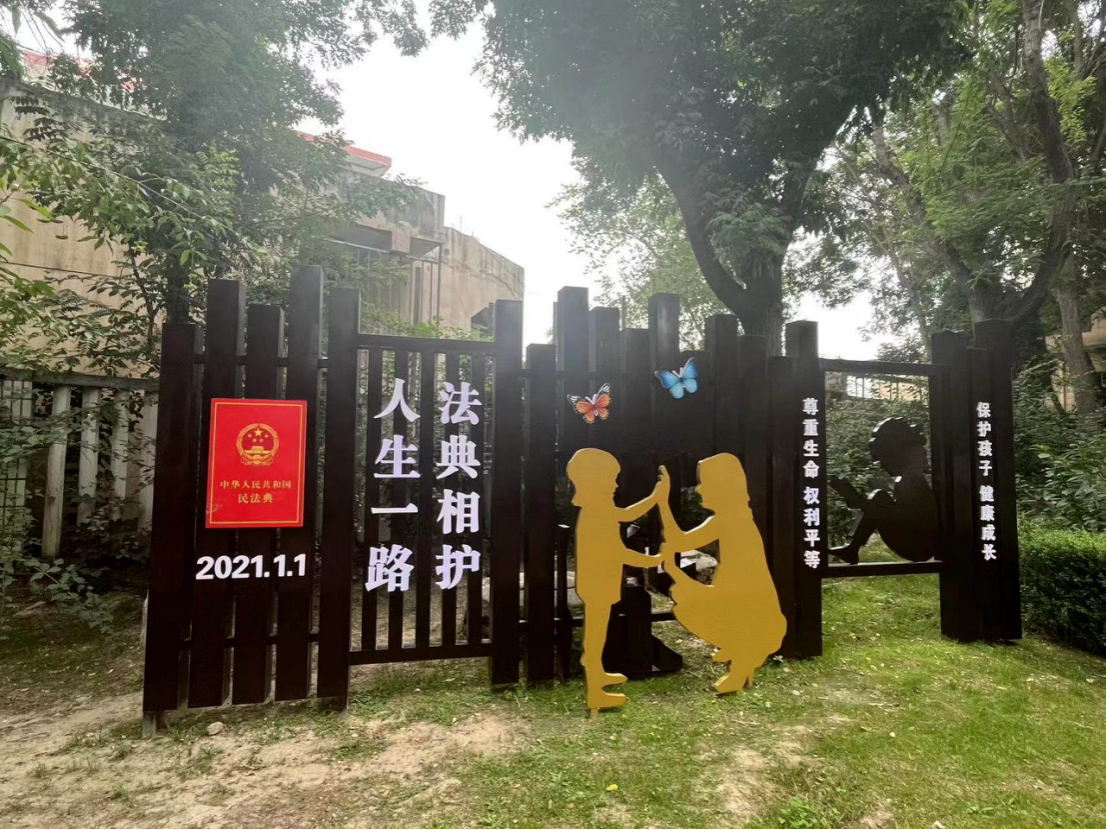 除了線上“第一課”,記者看到,金城公園設置憲心園、典護園、網(wǎng)絡安全主題區(qū)、法治文化廣場四大主題普法區(qū):憲心園設巨型《憲法》刻書;典護園設立了《民法典》宣傳建筑與母子雕塑;網(wǎng)絡安全主題區(qū)則以圓形建筑為“防護墻”,聚焦網(wǎng)絡詐騙、個人信息保護等,提升網(wǎng)絡安全意識;法治文化廣場融合明清仿古建筑與現(xiàn)代法律元素,設置《民法典》生活展牌、網(wǎng)絡普法園等。