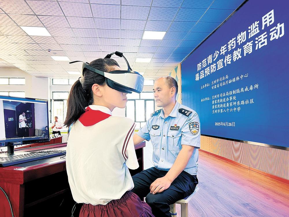 2025年6月26日,蘭州市司法局強制隔離戒毒所干警走進蘭州市第八十六中學(xué)開展禁毒宣傳教育。圖為學(xué)生佩戴VR眼鏡,通過虛擬現(xiàn)實技術(shù)創(chuàng)造逼真的沾染毒品場景,讓學(xué)生身臨其境地感受毒品的危害。