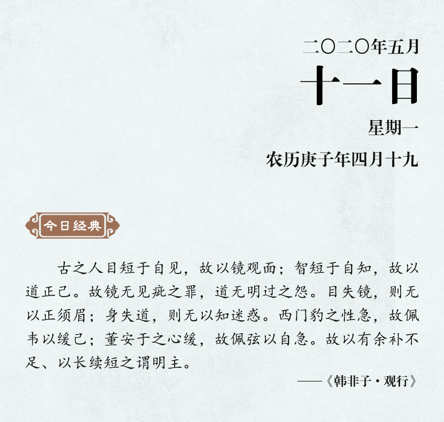 《老子》說:“知人者智,自知者明。”如果不能很好地認識到自己的長處和短處,就不能透徹地了解事物。韓非進一步說:“目短于自見,故以鏡觀面;智短于自知,故以道正己。”無論是明君還是賢人,都要明確認識到自身的不足,如此才能自知自見。“目失鏡則無以正須眉,身失道則無以知迷惑。”這既是說自見的局限,也是說自知的重要。韓非舉例說,魏國的西門豹因為性格急躁,所以佩戴柔軟的皮帶來提醒自己;董安于因為性子很慢,所以佩戴繃緊的弓弦來激勵自己,這兩位都是能夠自知不足的人。