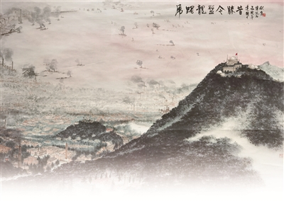 1949年4月23日,人民解放軍占領南京。毛澤東聞訊后,欣然寫下這首詩,描寫了人民解放軍橫渡長江、解放南京的雄偉壯闊、氣勢磅礴場面。在畫作中,畫家描繪的是南京城的壯麗景色,沐浴在朝暉之中的紫金山及其周圍景致,以浪漫的詩意呈現(xiàn)出來。近處,紫金山巍峨高聳,天文臺亦清晰可見;中景,江上輪渡往來,兩岸工廠林立,煙霧繚繞;遠處,紅霞爛漫,水天一色。新中國成立后的南京繁忙而祥和,墨色淋漓間,新中國欣欣向榮的景象躍然紙上。