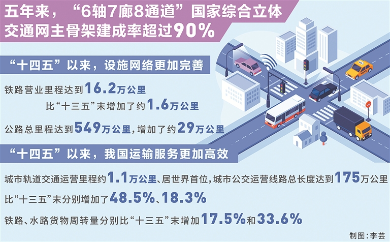 “人員貨物的高效流動彰顯了中國繁榮發(fā)展的活力。在過去一年中,平均每天約有1.8億人次跨區(qū)域出行、每天運送1.6億噸貨物、每天攬收4.78億件快遞。”劉偉說,“十四五”以來,我國運輸服務(wù)更加高效,軌道交通、常規(guī)公交、慢行交通網(wǎng)絡(luò)融合發(fā)展,城市軌道交通運營里程約1.1萬公里、居世界首位,城市公交運營線路總長度達到175萬公里,比“十三五”末分別增加了48.5%、18.3%。鐵路、水路貨物周轉(zhuǎn)量分別比“十三五”末增加17.5%和33.6%,港口集裝箱鐵水聯(lián)運量年均增速約15%。去年,全社會物流成本節(jié)約超過4000億元,其中交通運輸成本降低了約2800億元。
