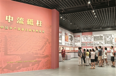走進(jìn)中國共產(chǎn)黨歷史展覽館四層專題展廳,首先看到一面紅底金字的大型展板,形似一本翻開的書本。“書”的正面,“中流砥柱”四個(gè)大字在燈光照射下閃閃發(fā)亮,下方緊跟一行小字“中國共產(chǎn)黨抗日戰(zhàn)爭(zhēng)檔案展”;側(cè)面,金色字體展示著毛澤東同志《中國共產(chǎn)黨在民族戰(zhàn)爭(zhēng)中的地位》里的內(nèi)容:“每一個(gè)共產(chǎn)黨員必須發(fā)揮其全部的積極性,英勇堅(jiān)決地走上民族解放戰(zhàn)爭(zhēng)的戰(zhàn)場(chǎng),拿槍口瞄準(zhǔn)日本侵略者。”