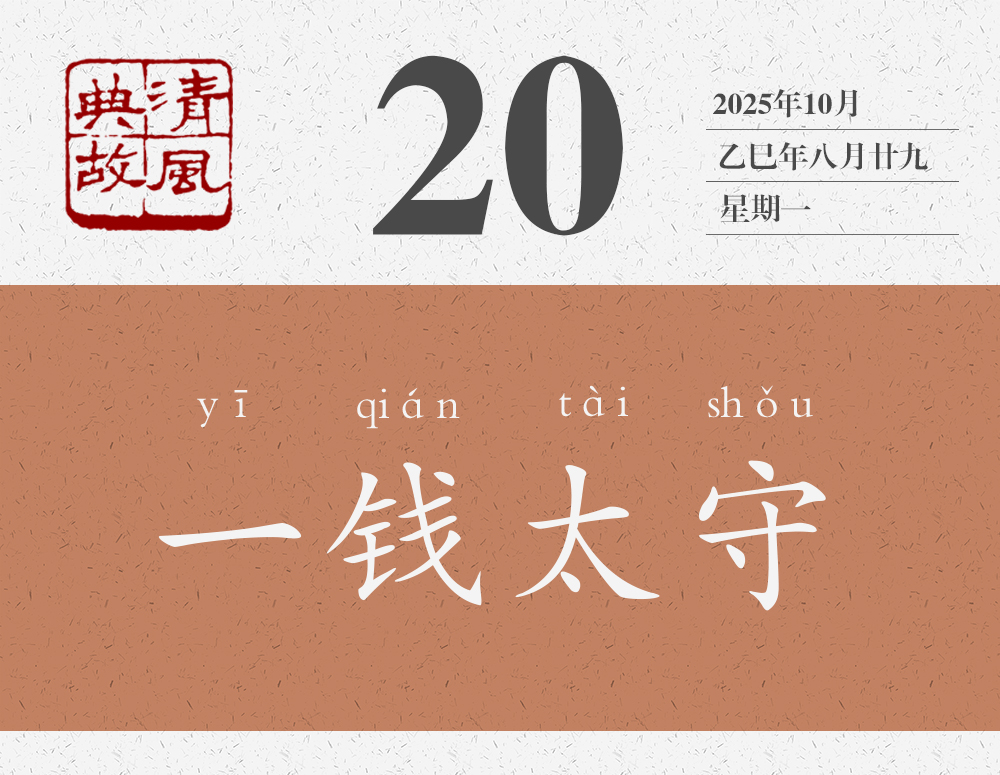 劉寵聽了他們的話說:“我的政績怎么能像您幾位說得這樣好呢?真是辛苦你們了!”為表示接受他們的美意,他從每個人帶來的錢中挑了一枚收下了。民間還流傳說,劉寵出了山陰界,就把收下的幾枚錢投進江里,江水頓時清澈見底。從此之后,此江便被稱為錢清江。劉寵去世后,人們在江邊修了一個亭子就叫“一錢亭”,為他修建了一座廟就叫“一錢太守廟”。“一錢太守”不僅成為劉寵的稱號,也成為后世稱頌地方官員為民造福、為政清廉的典故。明人高啟詩《野老行送陳大尹》:“雞鳴相送拜道邊,愿公受取一大錢。”