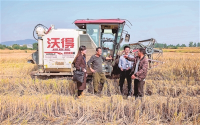 糧食安全是“國(guó)之大者”。安徽省含山縣紀(jì)委監(jiān)委聚焦高標(biāo)準(zhǔn)農(nóng)田建設(shè)管理中的突出問(wèn)題開(kāi)展一線走訪,推動(dòng)“糧田”變“良田”。圖為該縣紀(jì)檢監(jiān)察干部在環(huán)峰鎮(zhèn)城北村水稻收割現(xiàn)場(chǎng)了解相關(guān)情況。歐宗濤 攝