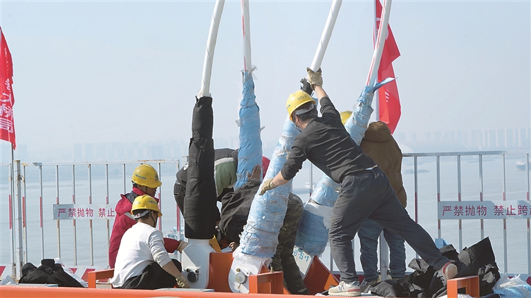 鋼桁梁吊裝到位后,施工人員連接吊索。施瑞 攝