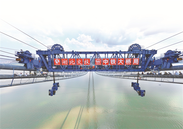 那就自己創(chuàng)造經(jīng)驗(yàn)!湖北交投牽頭聯(lián)合承建單位,在大橋建設(shè)前期進(jìn)行了大量數(shù)據(jù)論證和可行性試驗(yàn),一次次研究?jī)?yōu)化施工方案。他們堅(jiān)持設(shè)備優(yōu)化與工藝創(chuàng)新“雙管齊下”,應(yīng)用纜載吊機(jī)、液壓提升裝置等裝備創(chuàng)新施工方法,順利攻克了難關(guān)。