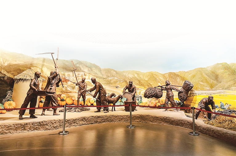 南泥灣大生產(chǎn)紀(jì)念館內(nèi)的雕塑作品。中國(guó)共產(chǎn)黨領(lǐng)導(dǎo)抗日軍民自力更生、艱苦奮斗,把南泥灣變成“陜北的好江南”。新華社記者 樊雨晴 攝