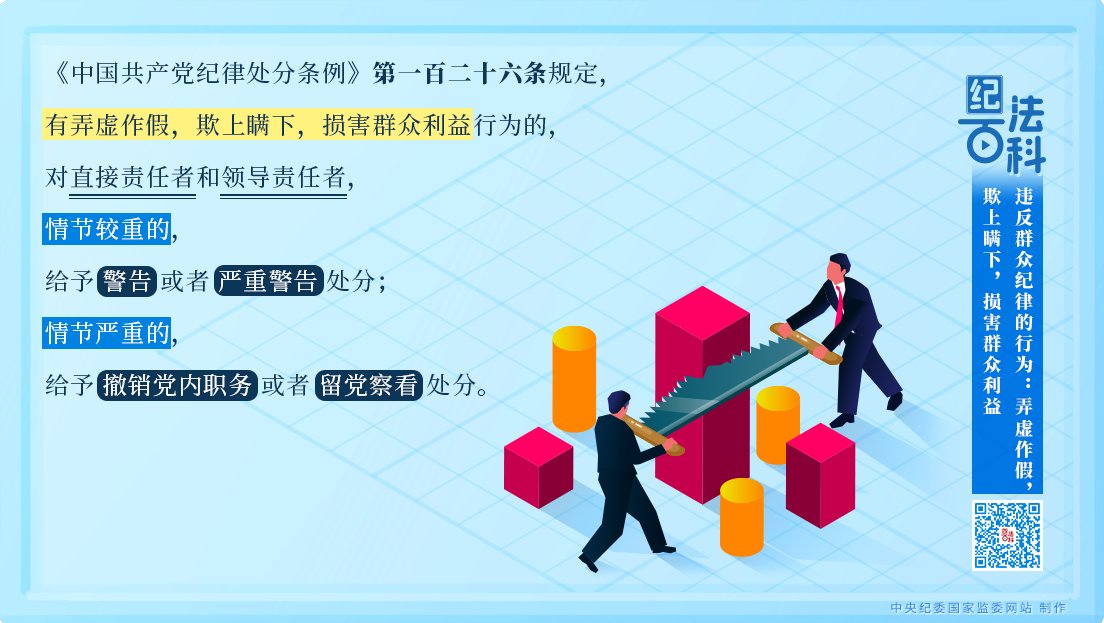 《中國共產(chǎn)黨紀律處分條例》第一百二十六條規(guī)定,有弄虛作假,欺上瞞下,損害群眾利益行為的,對直接責(zé)任者和領(lǐng)導(dǎo)責(zé)任者,情節(jié)較重的,給予警告或者嚴重警告處分;情節(jié)嚴重的,給予撤銷黨內(nèi)職務(wù)或者留黨察看處分。