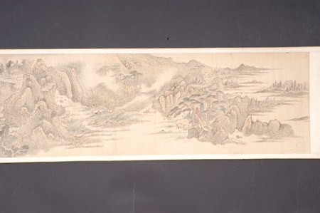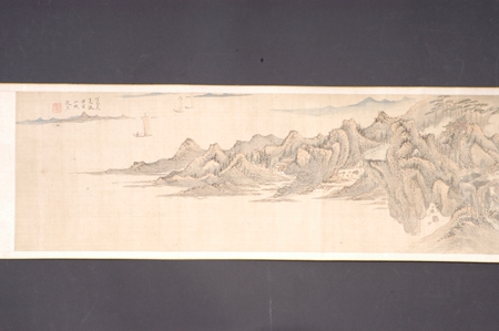 明代,設(shè)色山水長(zhǎng)卷,作者趙左,絹本??v高33.5厘米,橫寬230厘米??钍?ldquo;丁巳長(zhǎng)夏仿黃鶴山樵趙左”,鈐“趙左之印”白文方印。引首孫謀書題“江村僻幽”,卷中繪萬(wàn)壑千巖、奇峰危石、深澗幽谷、長(zhǎng)河帆影、茂林煙樹、孤村崇閣、云泉溪橋……正是作者理想中的歸隱之所。趙左(1573年-1644年),明代華亭(今上海松江)人,字文度,松江派重要畫家。