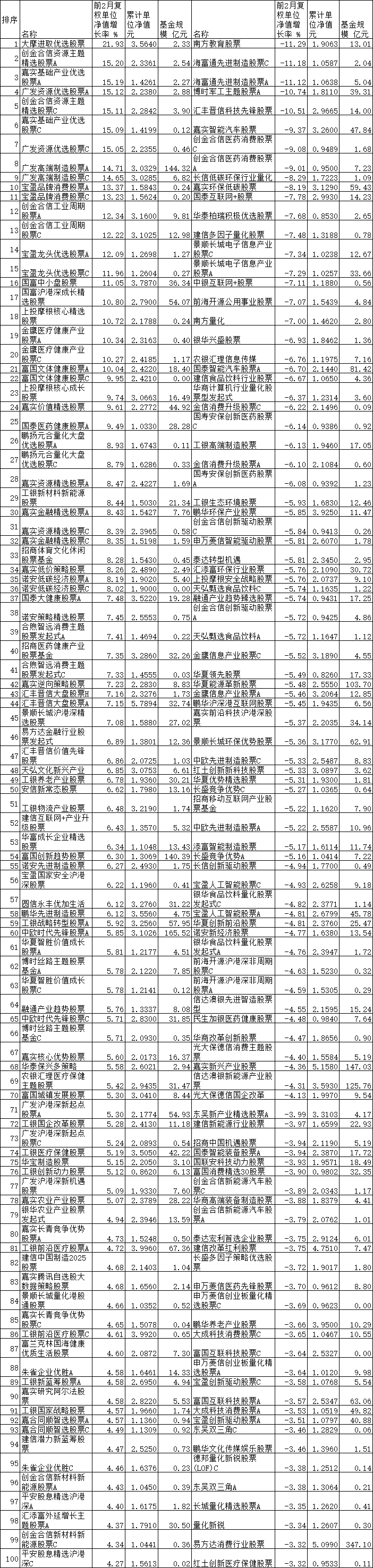 跌幅榜上,前2月跌幅超過10%的普通股票型基金僅有5只,跌幅超過5%的共有54只。跌幅靠前的基金大多重倉新能源、科技等行業(yè)個(gè)股,近期該類個(gè)股回調(diào)幅度較大,導(dǎo)致重倉基金業(yè)績回撤明顯。