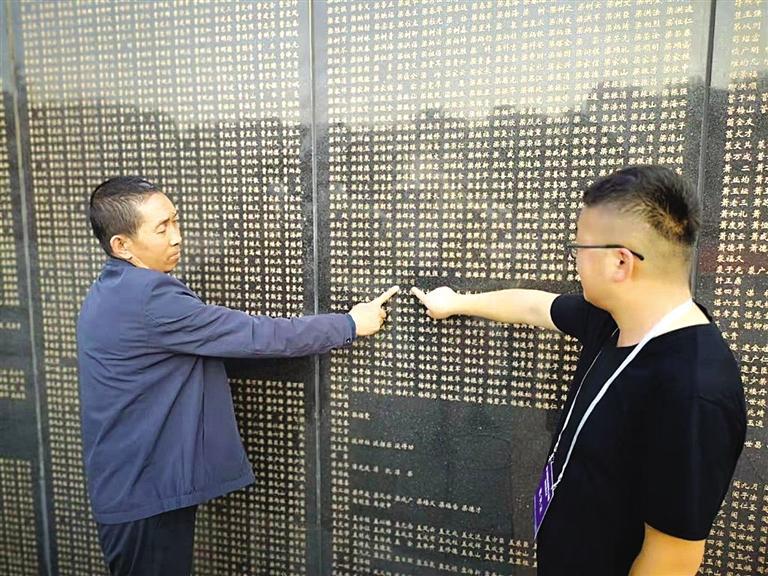 梁德保和梁潤全(右)在烈士陵園的英名墻上找到了親人的名字(甘肅省退役軍人事務廳 章小冬 供圖)