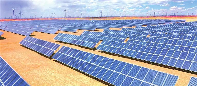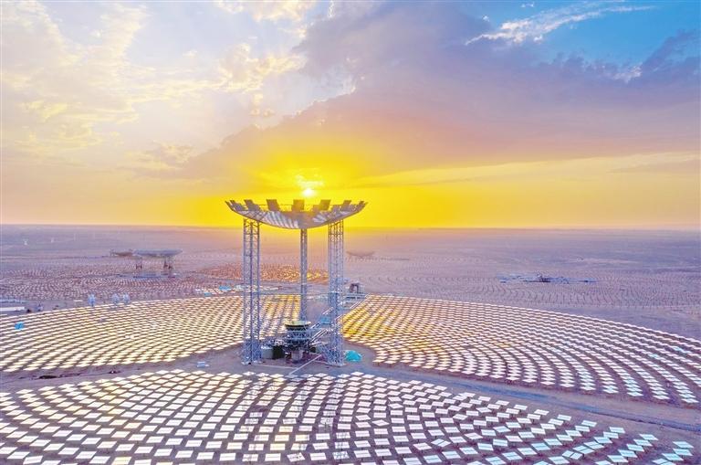 一排排風(fēng)電機組整齊列陣迎風(fēng)旋轉(zhuǎn),蔚然壯觀;成片的光伏板將茫茫戈壁裝點成浩瀚的藍色海洋,熠熠生輝;上萬塊定日鏡和吸熱塔構(gòu)成超級鏡子發(fā)電站,耀眼且震撼。