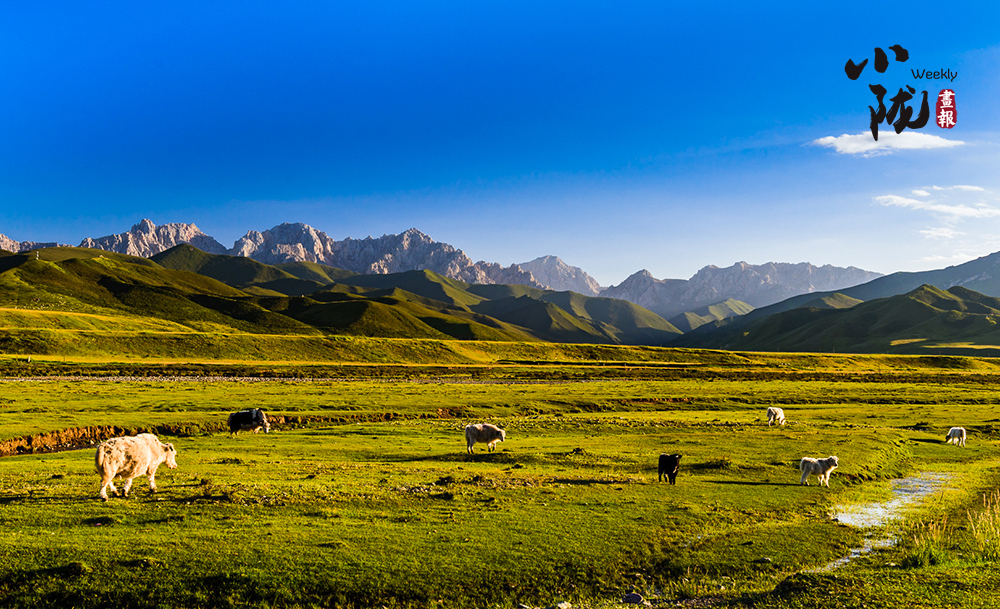 近處茵茵草場(chǎng),滿是嫩盈盈的綠;遠(yuǎn)處祁連山山脊起伏,黛綠色的基底上長(zhǎng)滿山花。