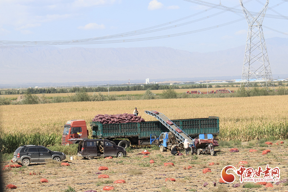 腳下有稻田,耳邊有水聲。帶著泥土的洋蔥整跺碼放,依次裝進(jìn)卡車?yán)铮r綠的高原夏菜在田間地頭收割后送進(jìn)發(fā)往南方的冷柜,百畝靑儲玉米經(jīng)過壓縮打包等待進(jìn)入牧場糧倉……祁連山下秋收正在火熱進(jìn)行中。