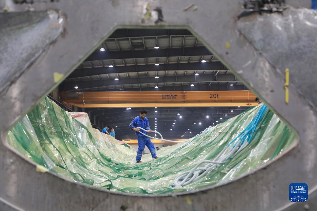 2月17日,在酒泉經濟技術開發(fā)區(qū)的一家風電葉片制造企業(yè),工人在風機葉片生產線為葉片灌注做準備。