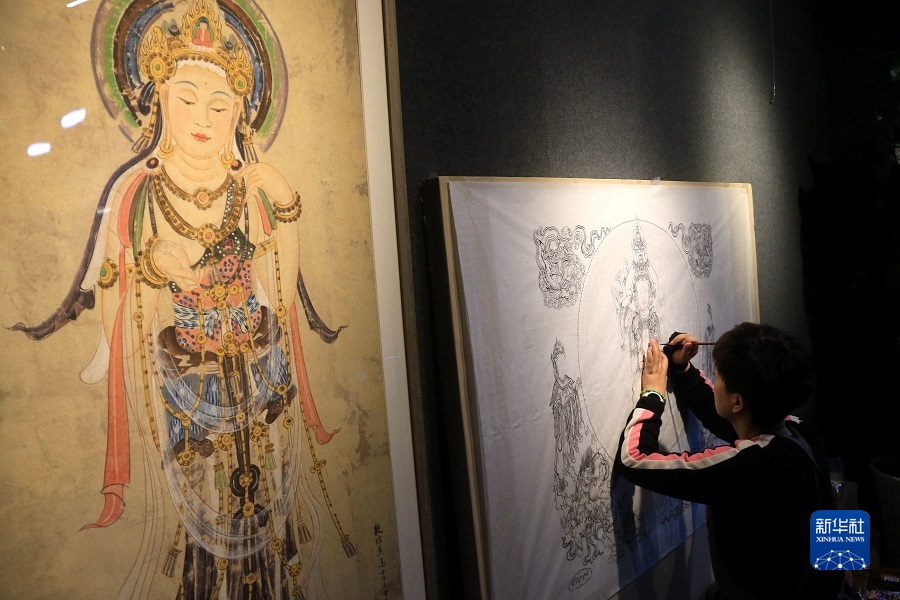 2月22日,在敦煌小鎮(zhèn)鳴沙書(shū)院,來(lái)自陜西的學(xué)員吳恩梵學(xué)習(xí)敦煌壁畫(huà)臨摹技藝。